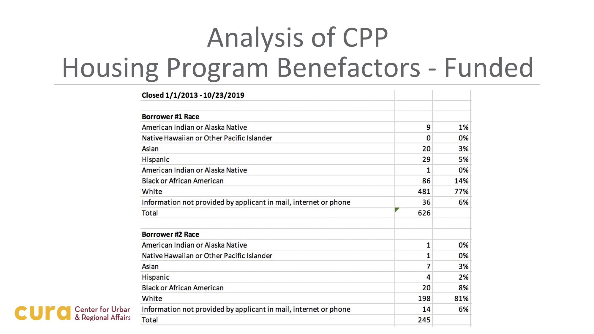 - The City's overall funding allocations since the takeover of the NRP program: the more diverse your neighborhood the greater the disinvestment. The less affluent, the greater the disinvestment. This is despite CURA's claims that the Community Participation Program was more equitable than NRP.