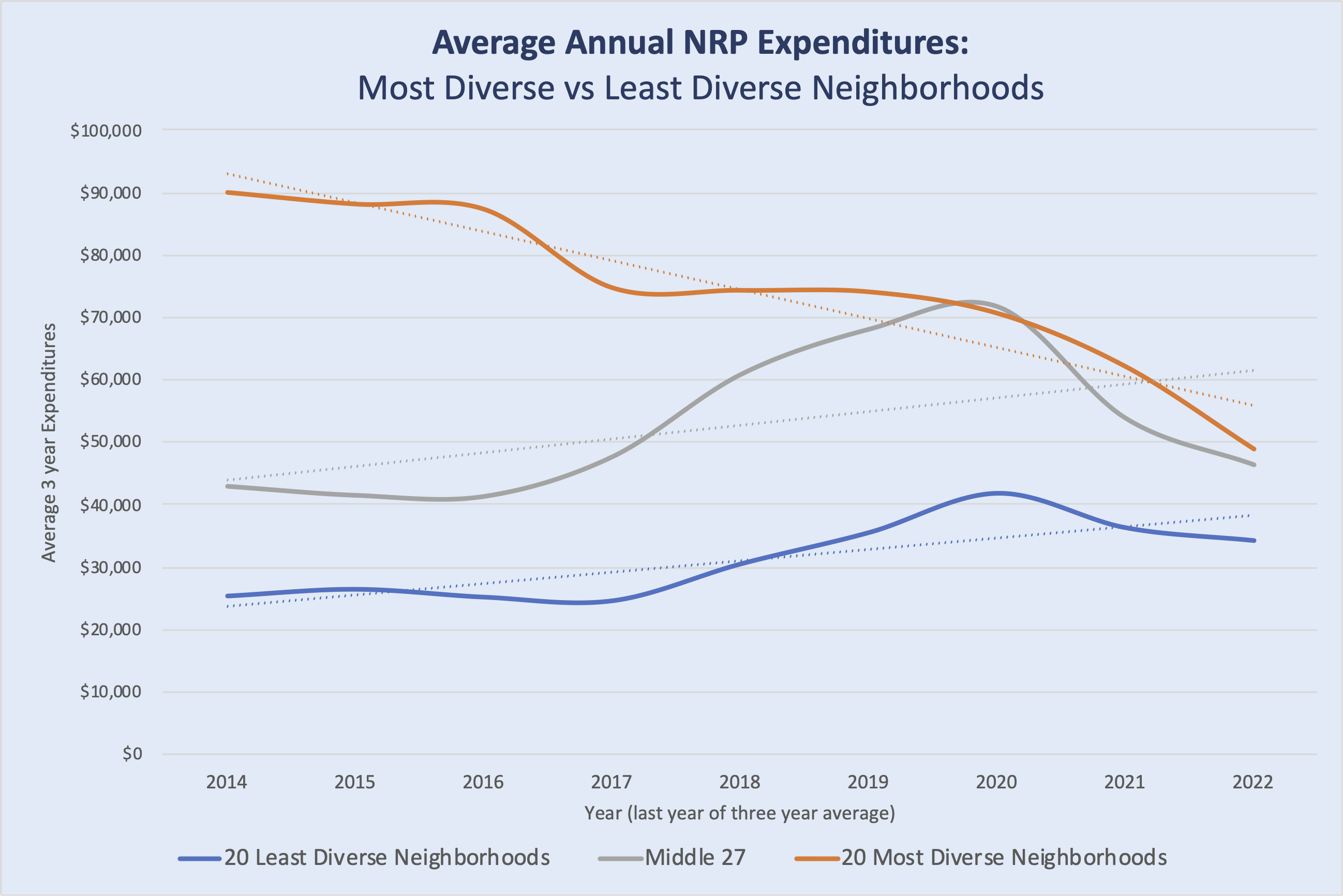 Chart 3 below compares average annual NRP expenditures for the twenty most diverse neighborhoods, compared to the twenty least diverse neighborhoods between 2014 and 2022.
