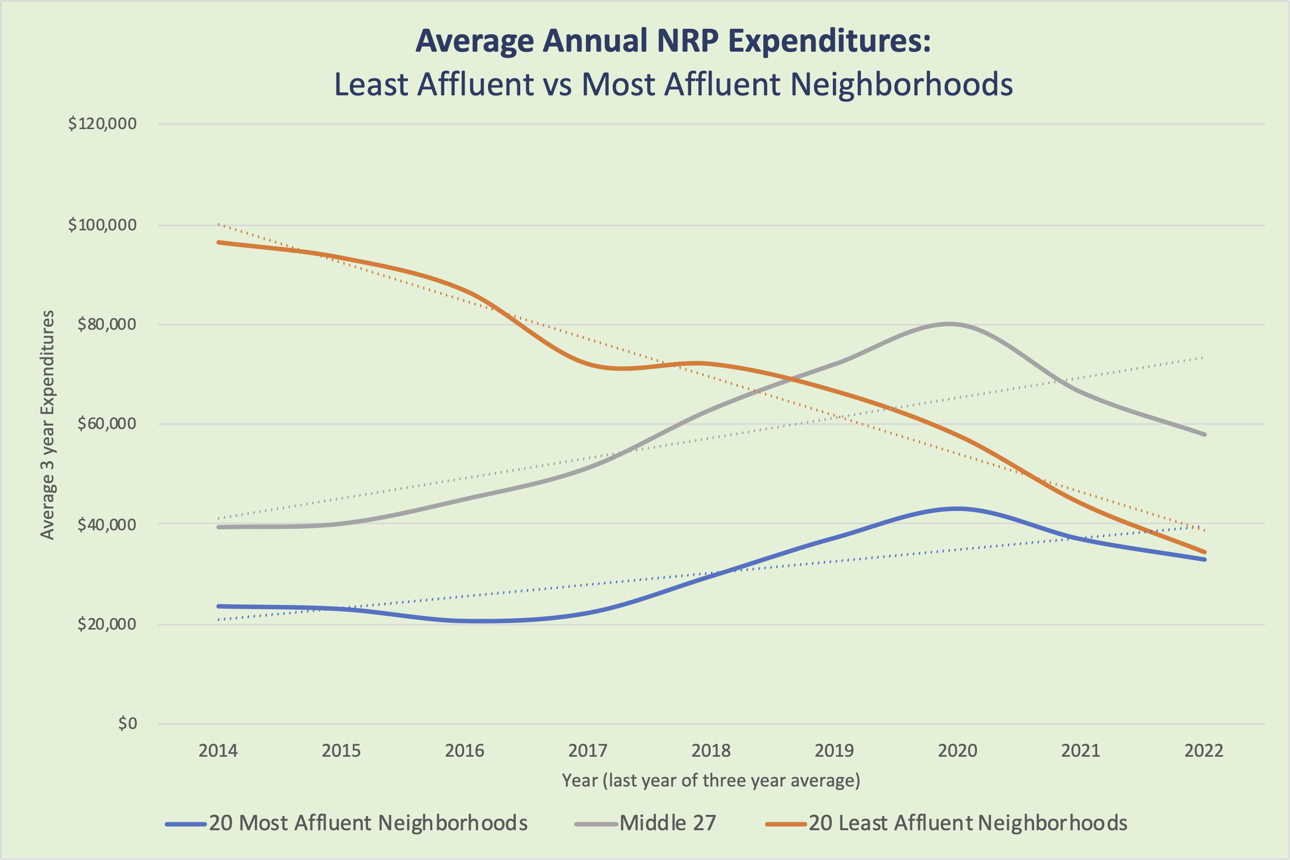 The chart at right compares the first three years of NRP expenditures under NCR compared to the last three years of our study, 2020 to 2022. The 20 most affluent neighborhoods saw an increase of annual NRP expenditures of 39.6%, while the 20 least affluent neighborhoods saw their annual expenditures fall by 64.3% on average.
