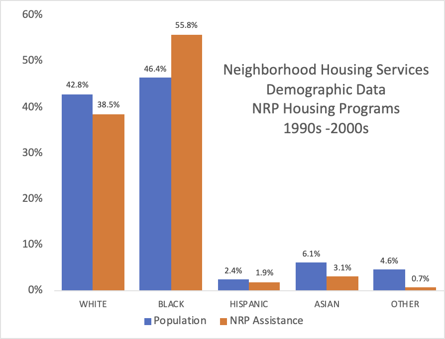 - NRP housing expenditures have also been less than equitable since the City takeover of the NRP program. The data clearly shows that, during the core NRP years, Black households received disproportionately more NRP assistance than white households.